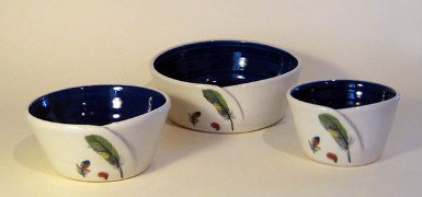 Judge Di Peach, had this to say about my work;"When nested I could see how well this set was proportioned, equally stepped in both height and diameter. They were precisely thrown, with a slit-and-crossover feature, and very neatly turned. Small colourful feathers so realistically hand painted I thought at first they were decals were positioned around the feature split and with a flawless glaze made altogether a very visually satisfying and functional set."
